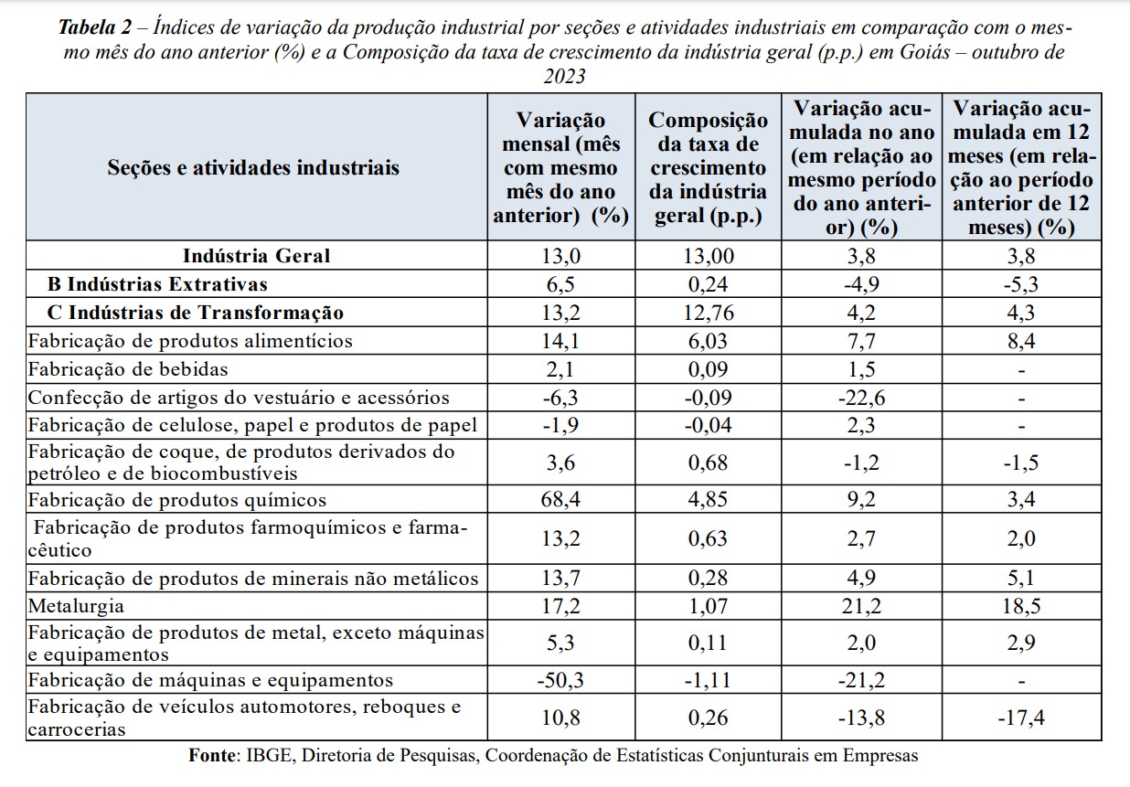 De acordo com os dados da Pesquisa Industrial Mensal – Produção Física (PIM-PF), a produção goiana cresceu novamente em outubro (2,1%), na comparação com setembro de 2023. Com isso, a indústria goiana registra o sexto mês consecutivo sem cair, na série com ajuste sazonal. Na comparação com outubro de 2022, o setor industrial goiano subiu ainda mais (13,0%), atingindo a sexta alta consecutiva, o que levou a um acumulado 3,8% de janeiro a outubro de 2023.